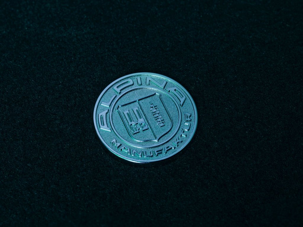 The black front floor mats have silver Alpina emblem pins and the trunk mat has a “MANUFAKTUR” wordmark.